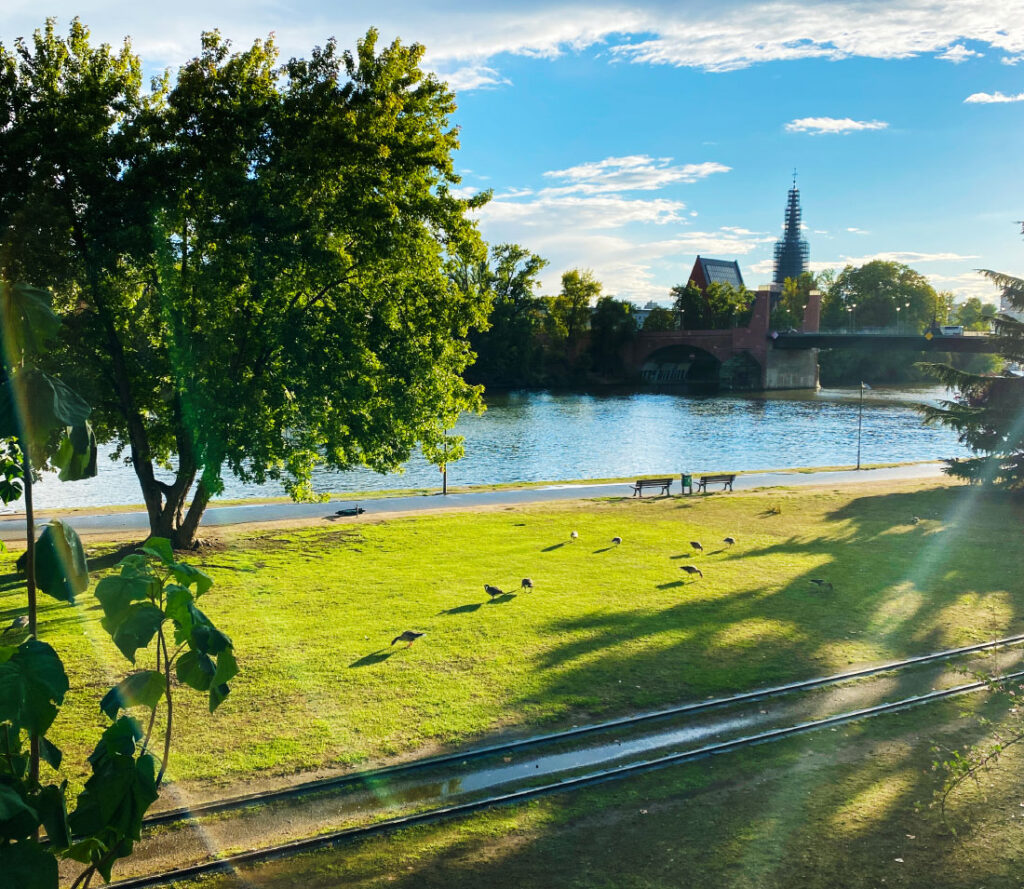 Det er ingen tvil om at Frankfurt er en grønn by. Byen er krydret med grønne parker, og langs elven Main er breddene viet til grønne rekreasjonsområder for byens beboere. Det jogges, luftes bikkjer og trilles unger. Gjess flekser vingemusklene og det SUP’es på selve elven. Mye morsomt å se på mens vi tråkker oss gjennom byen.